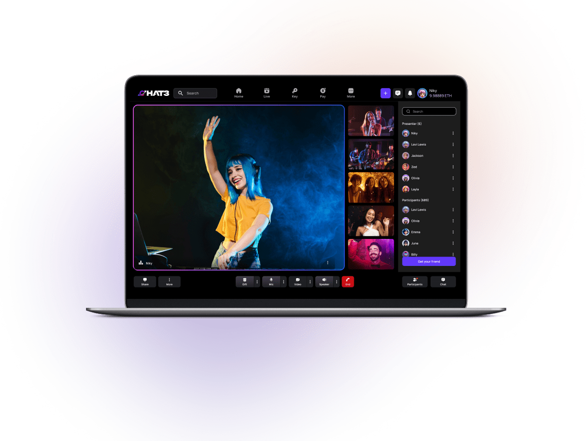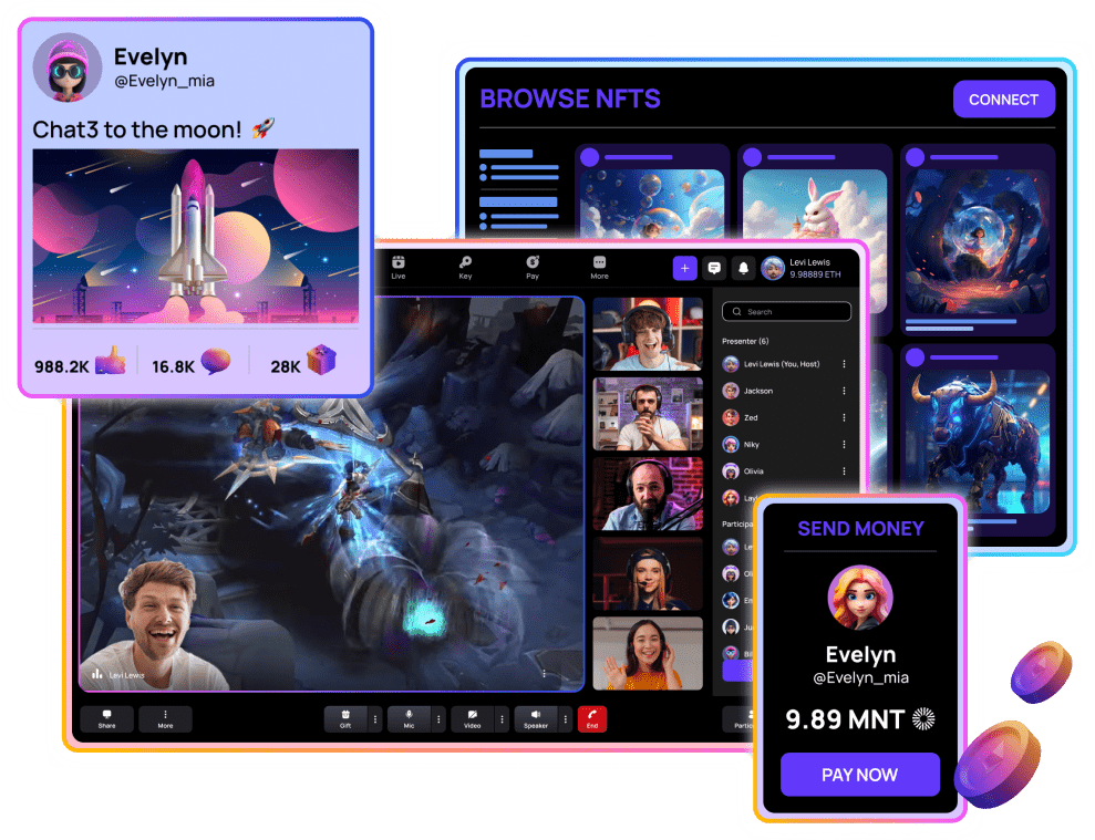 Chat3 is the first and only Socialfi platform offering real-time two-way video communications and interactive tools for up to 10,000 participants in a single room. Our U.S. patented decentralized video conference technology allows users to act as nodes on the video network, hosting segments of large rooms. These groundbreaking technologies enable creators to sustainably monetize their connections through live events for meetings, workshops, auctions, gaming, and entertainment.